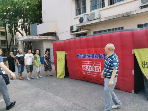随后,模拟高层建筑发生火灾场景,采用逃生帐篷进行消防疏散演习。整个过程大家按照逃生帐篷内消防疏散指示标识进行有序、快速的疏散,教育性极强,学习效果深刻。