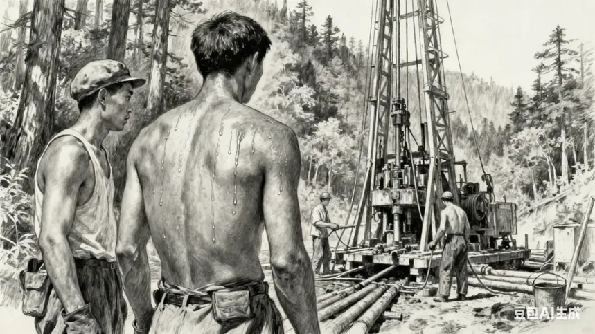 天等的山是“硬骨头”。钻探队要在龙茗镇的陡坡上布孔,60斤一根的“50”钻杆一人扛,钻机解体后靠八人抬,脚下是碎石路,手边没护栏,走一步滑半步。有次老李脚下一绊,钻杆往坡下滚,他扑上去死死抱住,膝盖在石头上磨出个血窟窿,只顾着喊“别碰坏钻杆”。那时的钻机是Xy宜昌科研所生产的-600型,机身震得人胳膊发麻,钻杆钻进石灰岩地层,每米都像在啃生铁。正午的太阳晒得钻塔发烫,工人们光着膀子,汗水顺着脊梁往下淌,在地上积成小水洼,裤脚沾满泥浆,干了就结成硬壳。最熬人的是雨季,暴雨冲垮了临时工棚,大家挤在钻塔下的草棚屋里,听着山洪在峡谷里咆哮,夜里只能抱着钻杆打盹,生怕钻机被冲走。可天一亮,雨刚小些,又扛着工具往钻场跑——国家等着锰矿炼钢铁,计划手册上的“硬指标”,容不得半点耽搁。